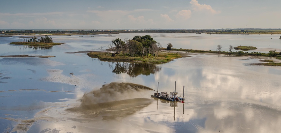 英亩损坏的沼泽地第一阶段开始于以战略模式挖掘通道,以使水流过沼泽。在一年的过程中,每周六天每天20个小时进行挖泥,以造成潮汐淹没,从而使盐水随着潮汐的流动。由此产生的泥浆为当地沼泽草生长创造了最佳栖息地,从而提高了该地区对暴风雨的弹性。